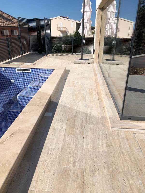 Travertino Light odlikuje se toplom svetlo-bež nijansom i prirodnom, diskretnom teksturom koja prostoru daje eleganciju i prirodan izgled. Njegova neutralna boja savršeno se uklapa uz plavetnilo vode, drvene dekove, travnate površine i moderne fasade.