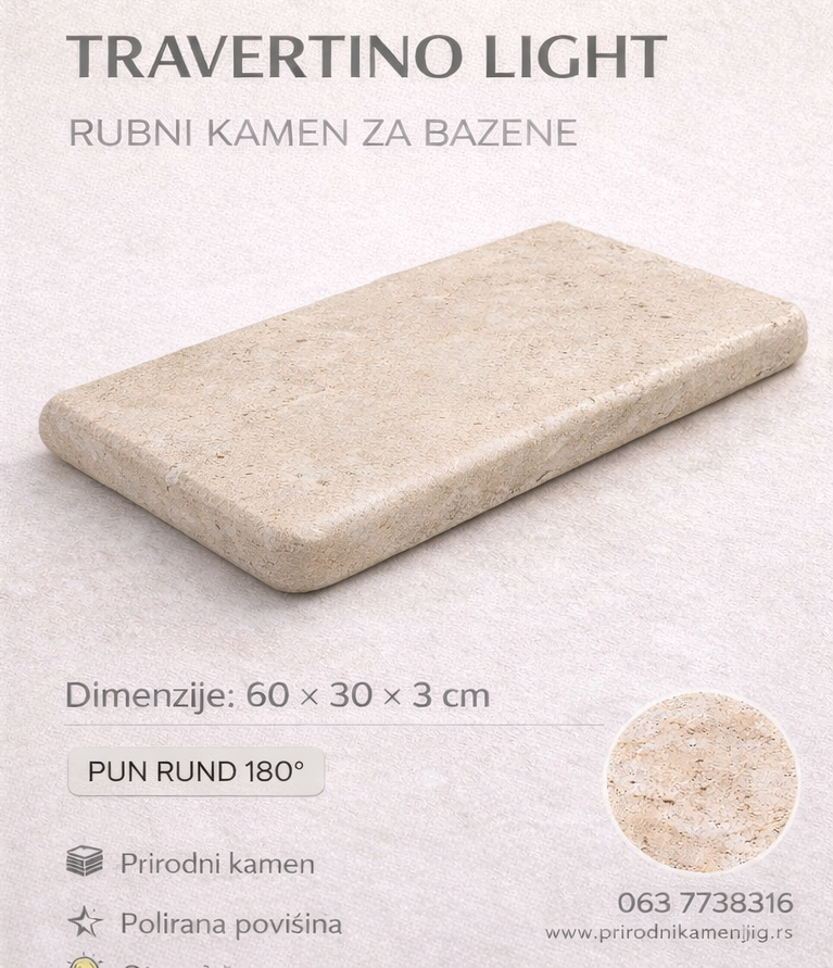Blago zaobljena (bullnose) prednja ivica obezbeđuje estetski čist završetak i prijatan osećaj pri hodu, što ga čini idealnim za ivice bazena, stepenike i terase. Prirodni travertin je dugotrajan, otporan na spoljašnje uslove i jednostavan za održavanje.