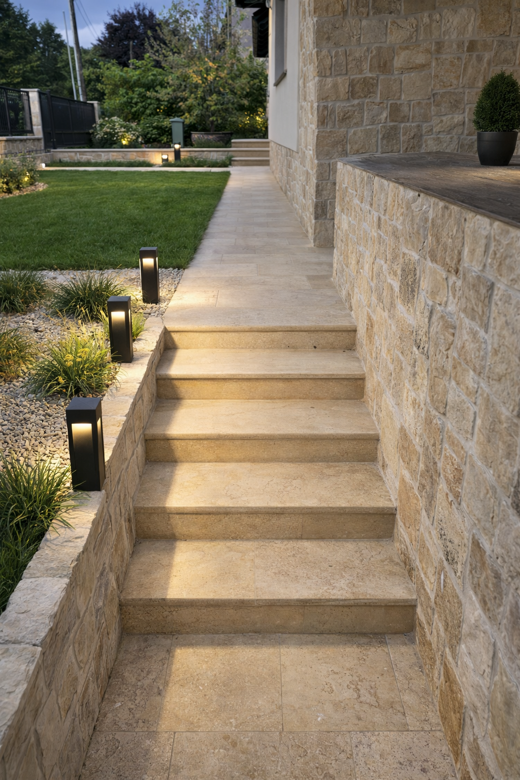 Travertino Luxor kamene stepenice predstavljaju idealan izbor za sve koji žele kvalitetan, prirodan i dugotrajan materijal za ulaz u kuću ili dvorišni prostor.